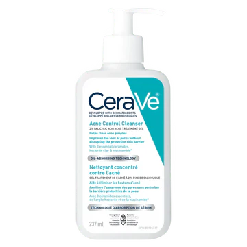 CeraVe is the #1 dermatologist-recommended cleanser brand for acne*, and our Acne Control Cleanser with 2% salicylic acid is formulated to clear acne, reduce blackheads and improve the appearance of pores, while purifying clay helps absorb excess oil.